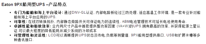 9PX 船用型UPS是業內同尺寸產品中首款提供整功率因素 (VA=W)的UPS. 比其他UPS提供多11%的能量. 9PX船用型擁有最高的效率, 并獲得能源之星認證.可以最大程度的降低能耗并減少系統的冷卻成本.