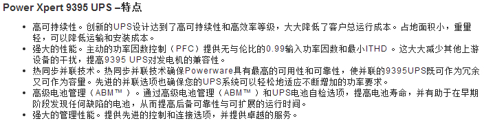 Power Xpert 9395UPS,結合技術創新,提供豐富功能。為大型數據中心,醫療設施和其他核心系統提供高功率密度的一流電源保護。高系統效率顯著降低運行費用。雙轉換拓撲結構使得可靠性萬無一失,同步并聯技術確保能夠滿足當前和未來電力需求。