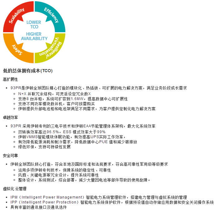 93PR模塊化UPS及關鍵電力保護系統采用當今先進的及伊頓專利的電力電子技術,由伊頓全球團隊傾心打造,符合高可靠性軍用等級要求,綜合設計,系統測試和驗證的系統,減少大量因電池等部件導致的使用故障,確�?蛻魳I務持續運行。采用伊頓專利的三電平技術,雙變化效率高達96.5%,交流直供模式下效率大于99%,有效降低客戶總體擁有成本(TCO)�?梢匀鏉M足從網絡配線間、中小數據中心到大型數據中心的應用及自動化或醫療等應用場所的電力保障要求。