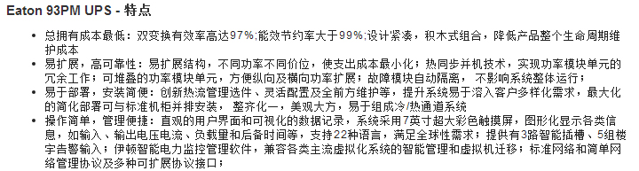 伊頓93PM系統(tǒng)提供了完整的機(jī)房整體基礎(chǔ)電力系統(tǒng)。系統(tǒng)包括了一個(gè)關(guān)鍵的核心機(jī)房的中所有供電的基礎(chǔ)設(shè)施:輸入/輸出饋線單元、輸入配電單元、可擴(kuò)展功率模塊單元、維修隔離單元、儲(chǔ)能單元、監(jiān)控單元、輸出配電單元,如果需要,也可與伊頓的IT專用機(jī)柜、可編程型智能PDU組成完整的機(jī)房基礎(chǔ)架構(gòu),更可與伊頓的AMS/HRS熱流管理系統(tǒng)配套,通過市場(chǎng)領(lǐng)先的運(yùn)營效率和世界級(jí)的智能化管理確保以最低的總擁有成本實(shí)現(xiàn)關(guān)鍵體系的持續(xù)運(yùn)行。